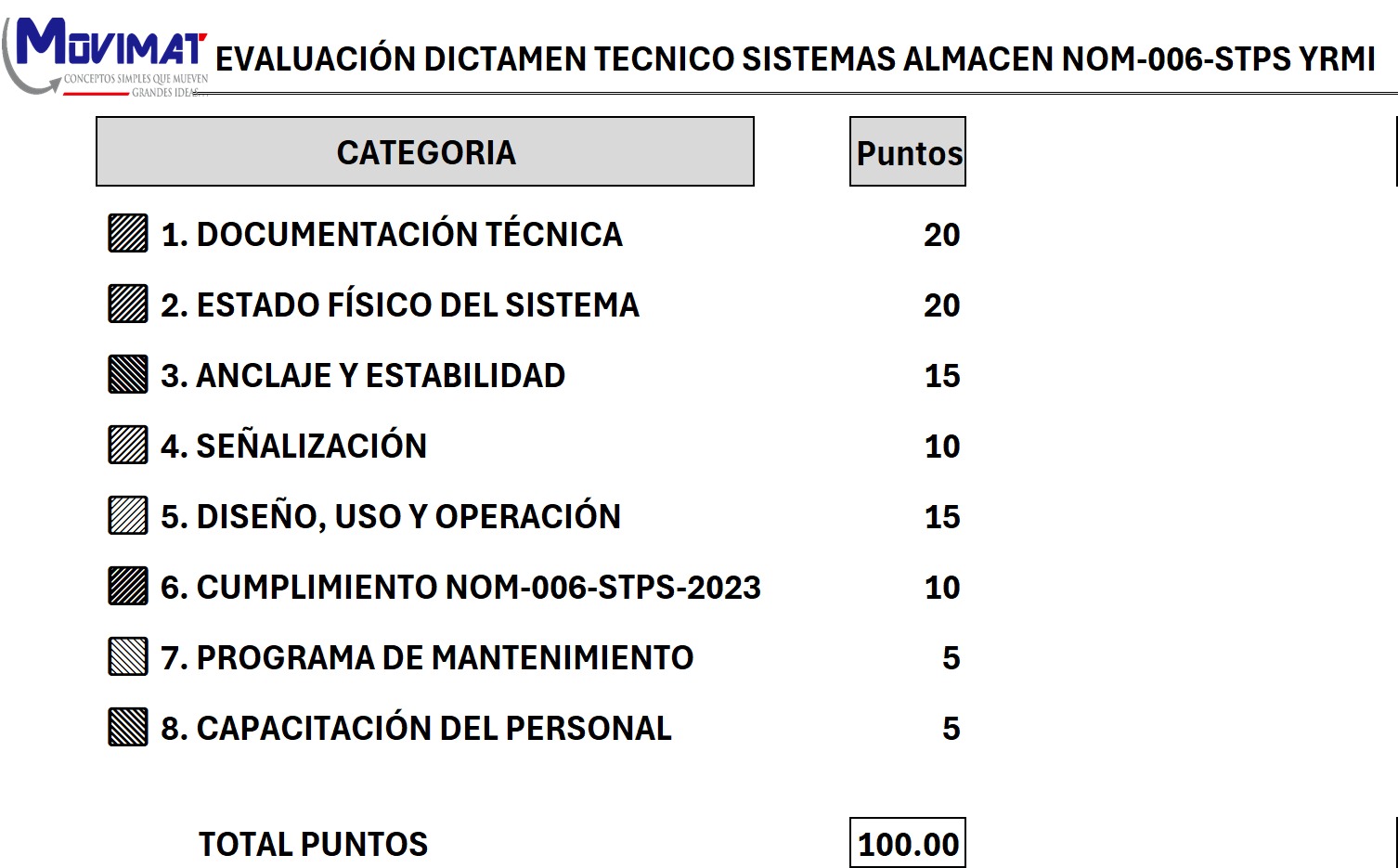 Cada una de estas áreas aporta un puntaje que, en conjunto, determina el Índice de Cumplimiento NOM-006-STPS-2023 (100 puntos totales):